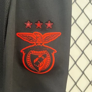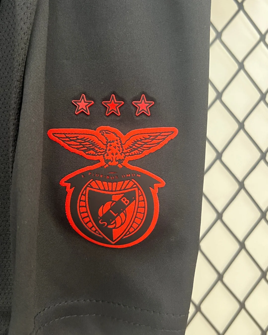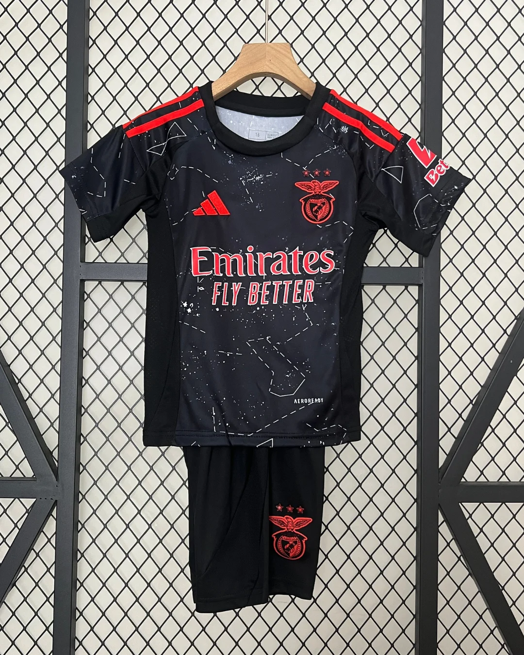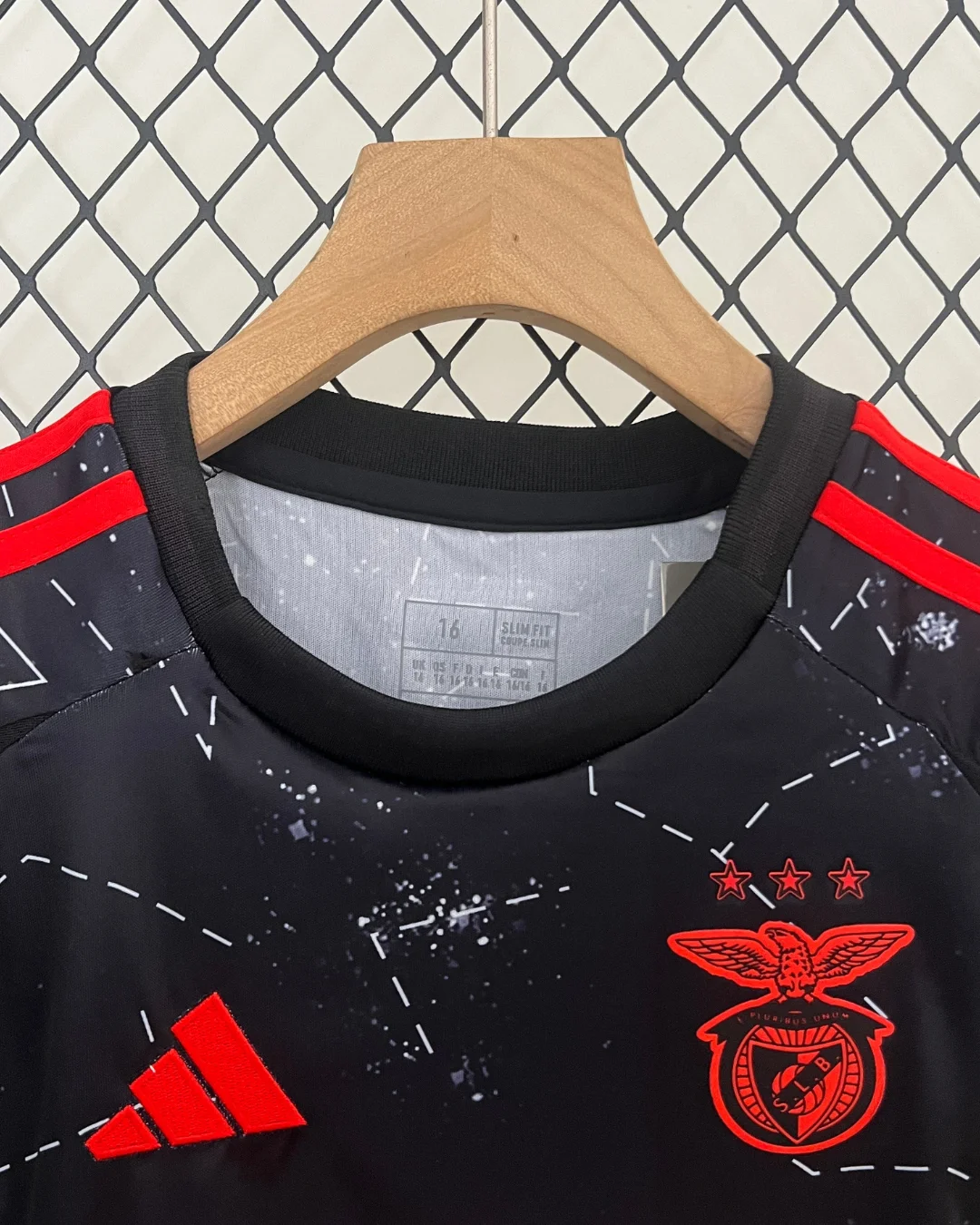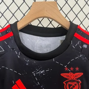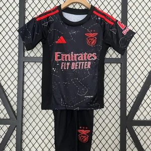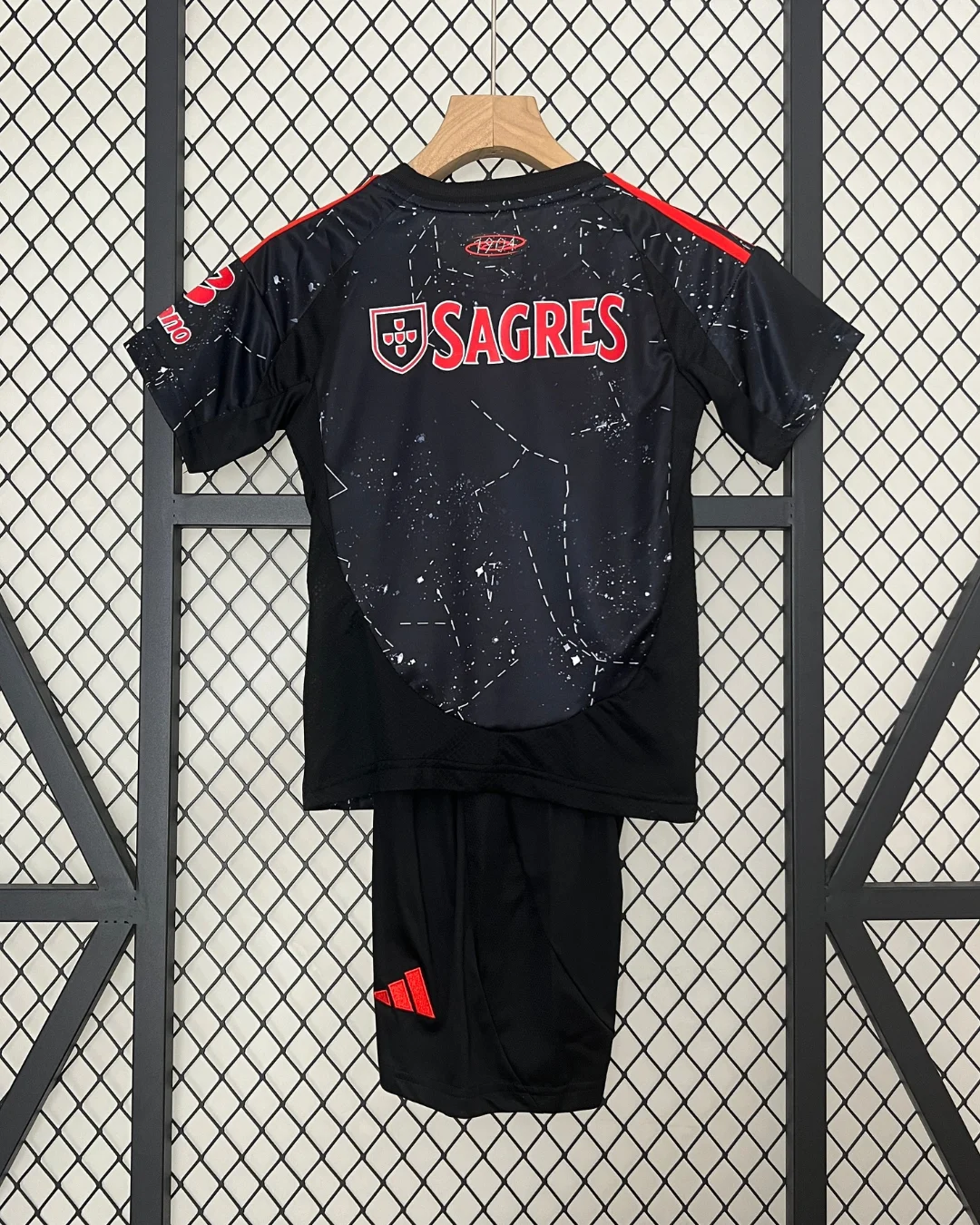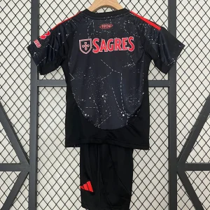 SL Benfica Kids 24/25 Away Kit features a sleek black base with a star-inspired embossed pattern symbolizing the club’s founding night sky on February 28, 1904, accented by red lines on shoulders and sleeves for a meteoric tribute to fans.