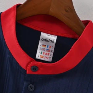 The SPAIN 1996 AWAY JERSEY is a classic retro football shirt that captures the bold and vibrant style of the Spanish national team during the UEFA Euro 1996 tournament. Designed by Adidas, this iconic jersey features a deep navy blue base accented with striking red and yellow details that symbolize the colors of the Spanish flag.
