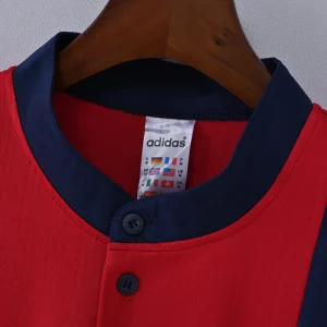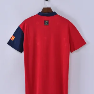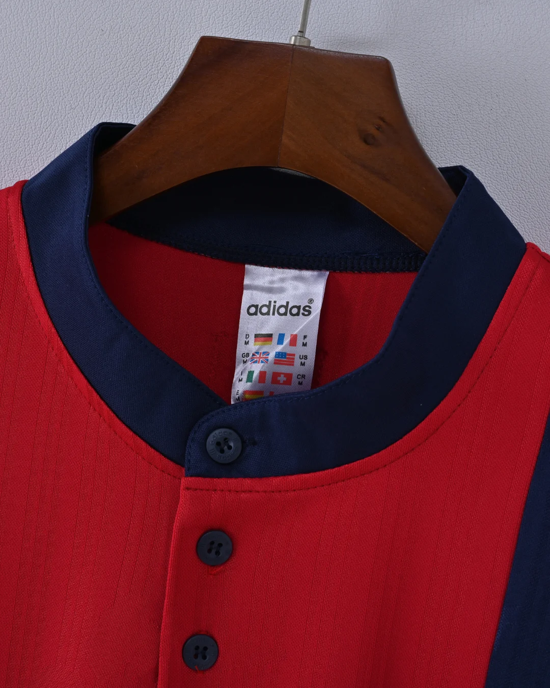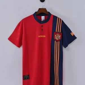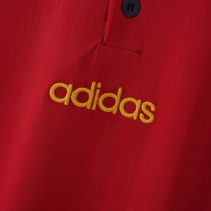 The SPAIN 1996 HOME JERSEY is a classic retro football shirt that embodies the spirit and style of La Roja during the UEFA Euro 1996 tournament. Made by Adidas, this jersey features a bold red base, capturing the passion and heritage of the Spanish national team. It is designed with a loose, era-appropriate fit and includes signature details such as a two-button ribbed henley collar and navy trims that add a sharp contrast.