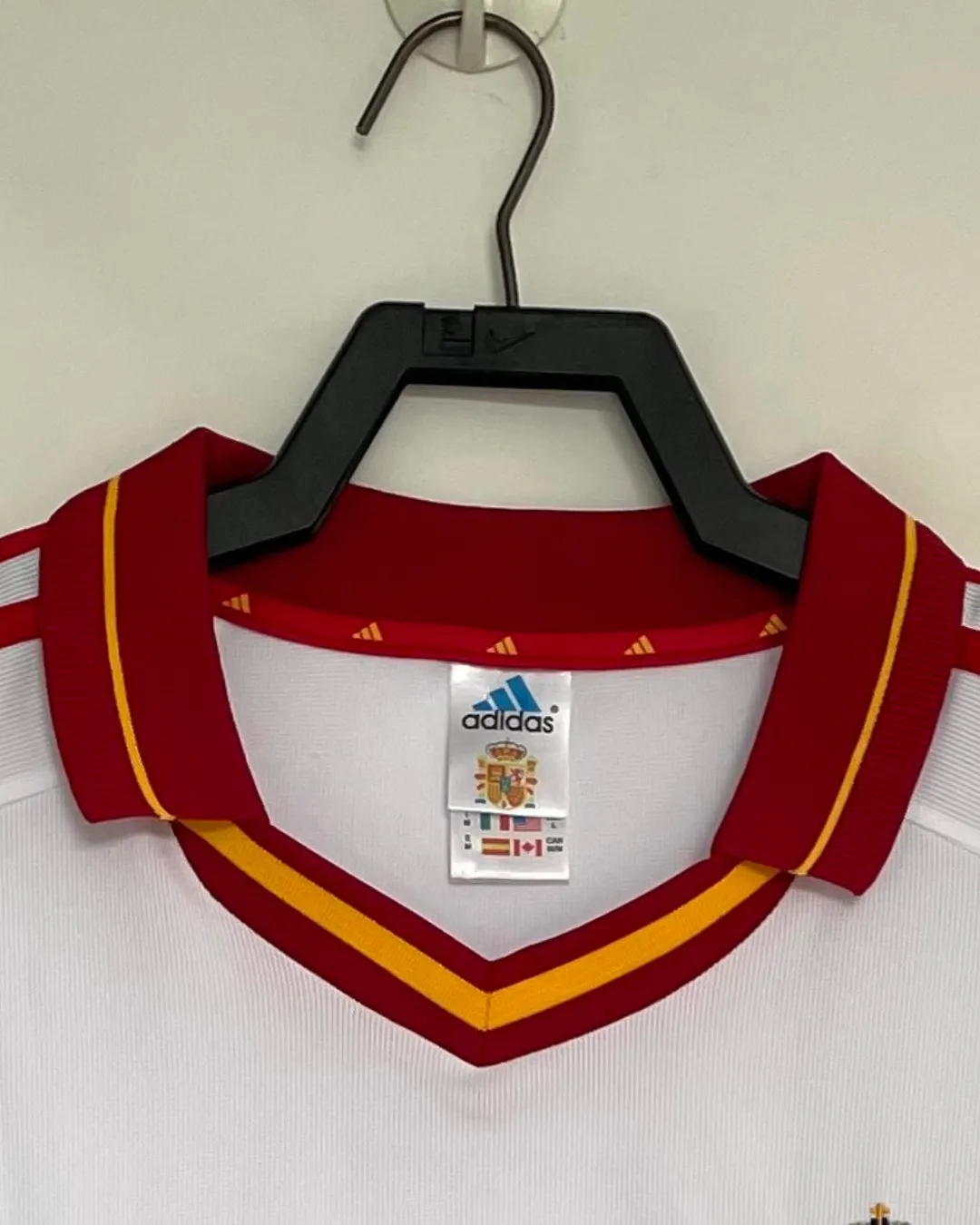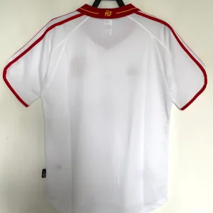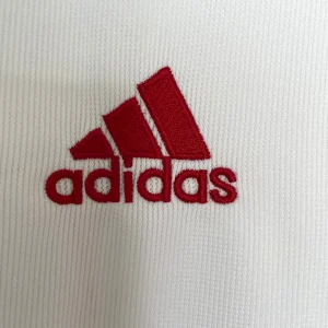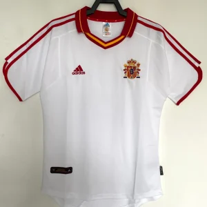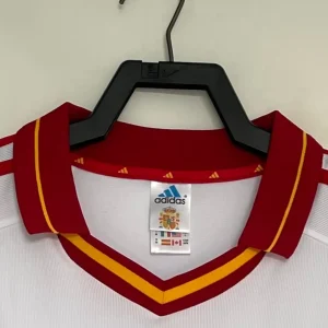 Relive Spain’s Euro 2000 qualification campaign with this classic 2000 Away Jersey from Adidas, worn during their group-topping performance despite the infamous Cyprus upset. The elegant white base features red and yellow trims on the collar and cuffs with the embroidered RFEF coat of arms crest on the left chest opposite the Adidas trefoil logo, capturing late-90s Spanish sophistication.