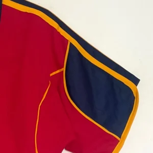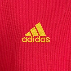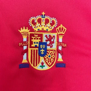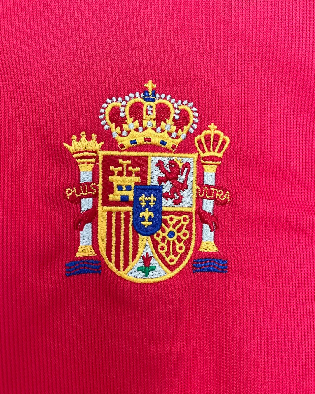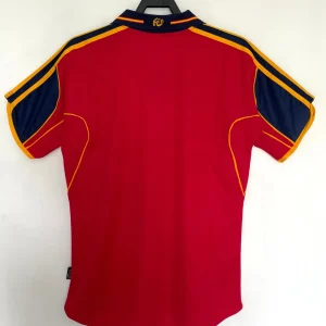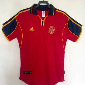 Power La Roja’s Euro 2000 campaign with Spain’s classic 2000 Home Jersey from Adidas, worn during their quarterfinal run featuring Gaizka Mendieta’s penalty heroics against France. The iconic bright red base showcases the yellow and navy accents on the V-neck collar and signature three stripes along the shoulders, paired with the embroidered RFEF coat of arms crest on the left chest opposite the Adidas logo for quintessential late-90s Spanish elegance.
