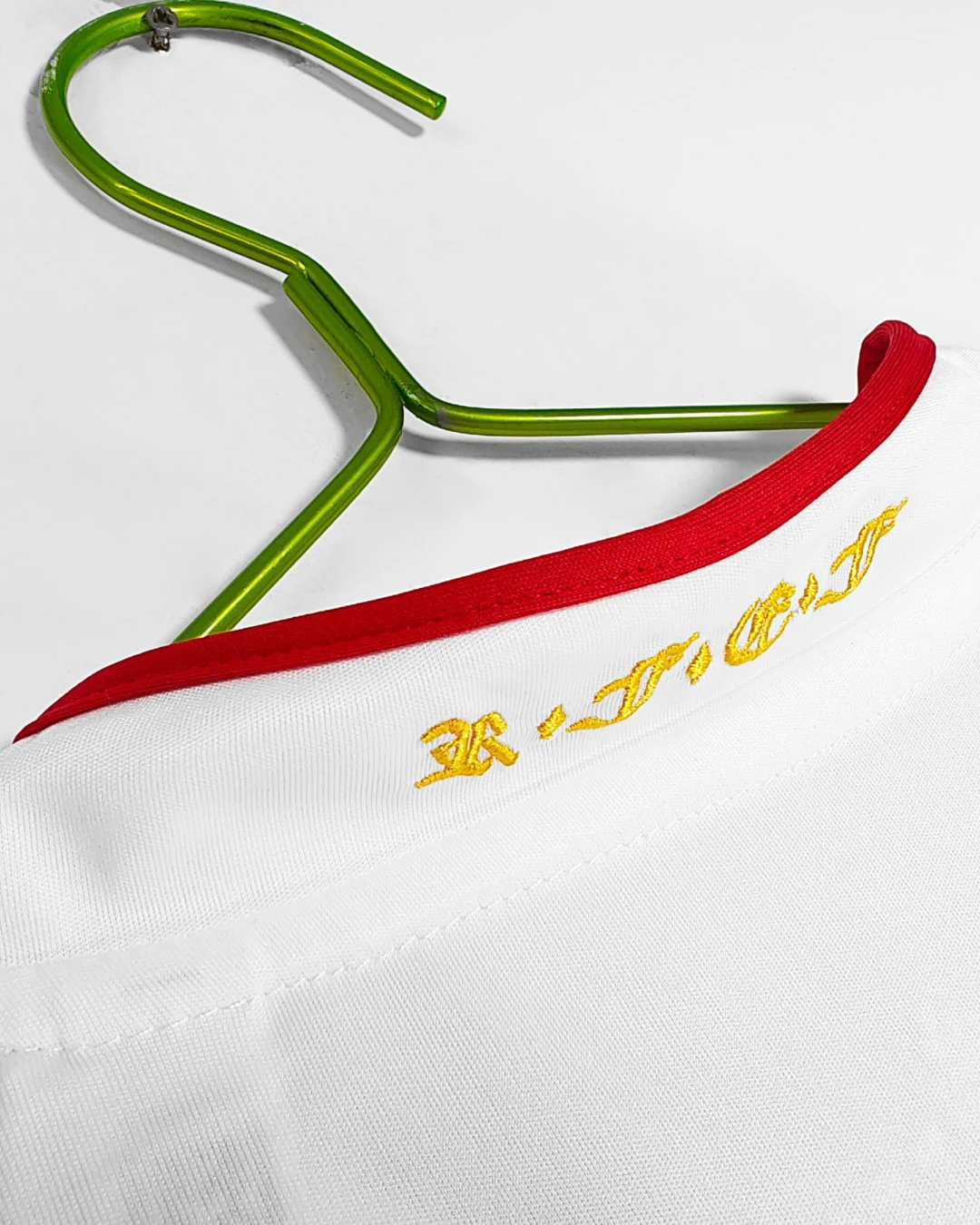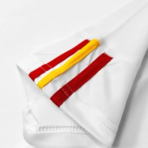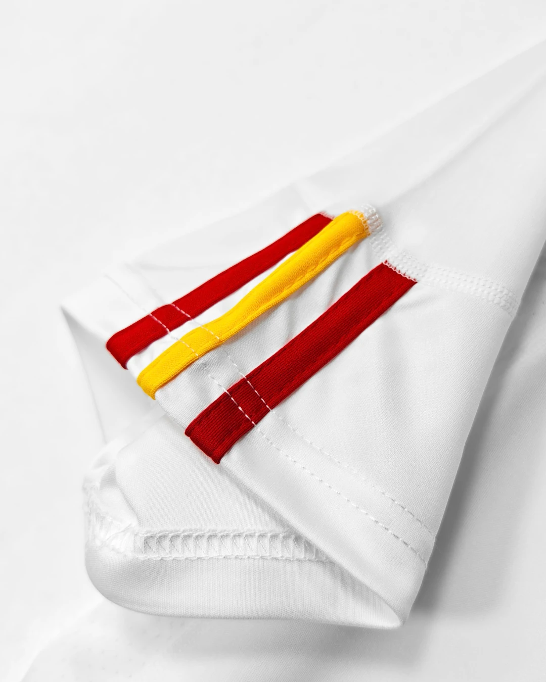 • White base with red and yellow adidas shoulder-to-cuffs stripes