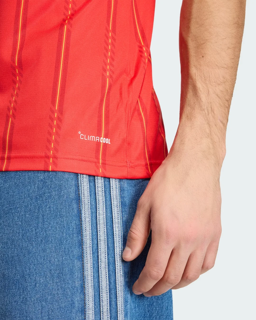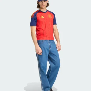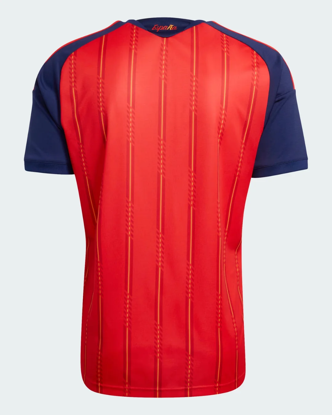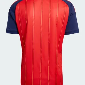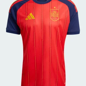 Unleash La Roja’s passion with the Spain 2026 WC Home Stadium Jersey from Adidas, honoring Spanish football elegance. Predominantly vivid red body with dark navy sleeves, it showcases thin vertical yellow pinstripes with dotted detailing running down the front, first striped home kit at a World Cup since 2006, complemented by red-yellow-red Three Stripes on shoulders matching the national flag, crew neck collar with “ESPAÑA” text, embroidered RFEF crest resembling a stylized bomb in certain lighting, and Adidas logo debuted in recent European qualifiers.