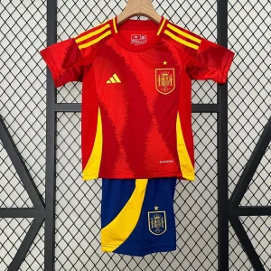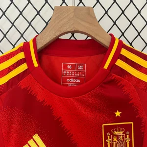 Spain’s 2024 Home Kids Jersey from Adidas celebrates La Roja’s rich soccer heritage and Euro 2024 triumph through iconic red fabric with subtle yellow trim accents on sides, badge, and Three Stripes, featuring wavy carnation embroidery on the collar back symbolizing Spain’s national flower blended with ocean motifs surrounding the Iberian Peninsula. Perfect for young Spanish national team fans supporting Lamine Yamal #19, Pedri #8, and Nico Williams #17, this replica incorporates AEROREADY moisture-wicking technology to stay dry, breathable mesh ventilation panels, woven Spain crest on chest, ribbed crewneck collar for comfort, 100% recycled polyester interlock construction promoting sustainability, short sleeves, and regular kids fit.