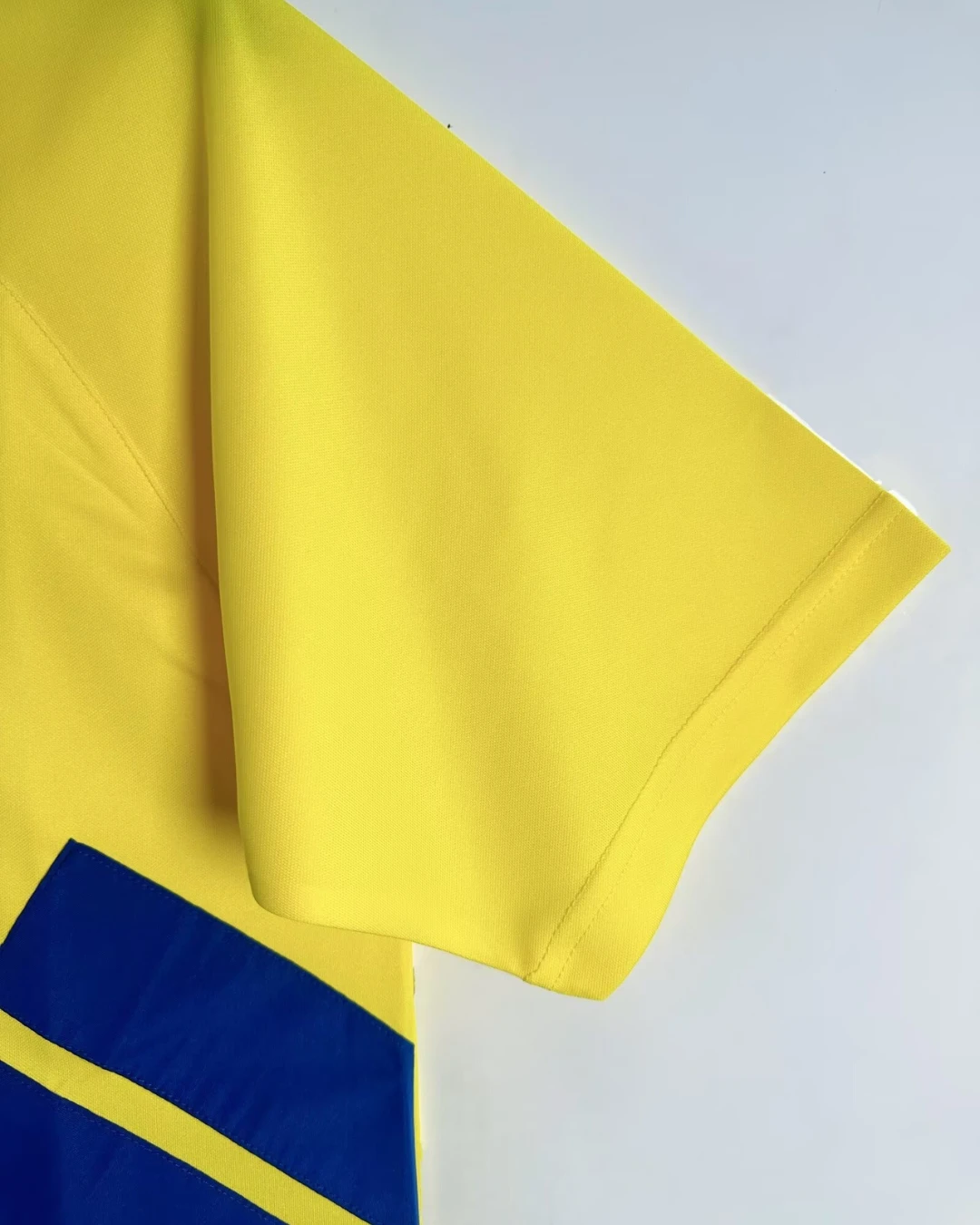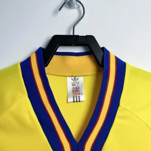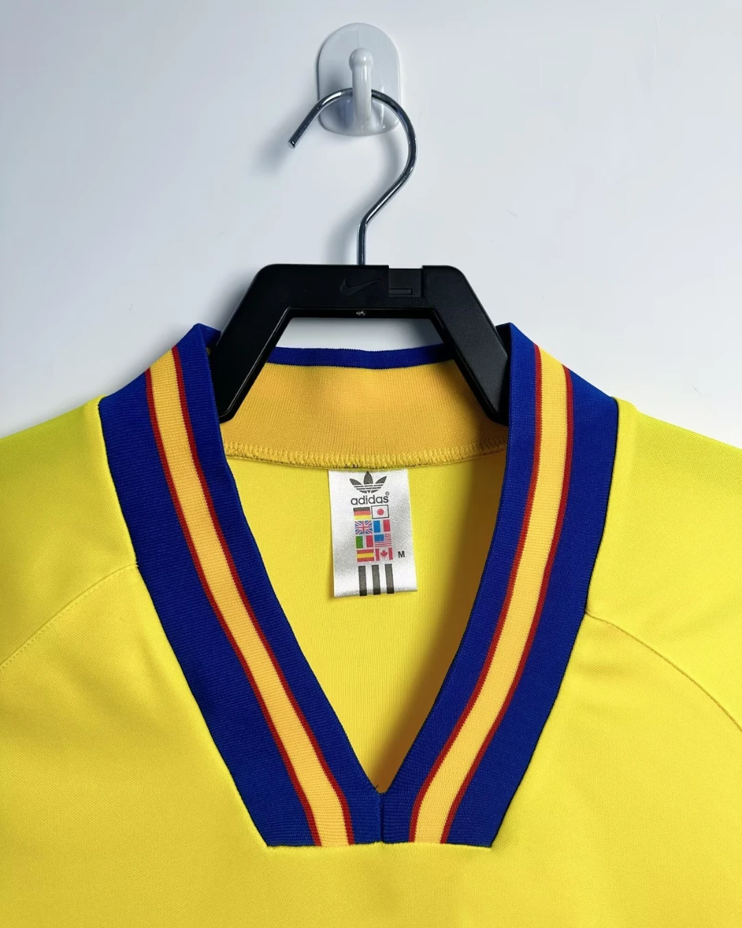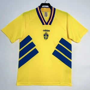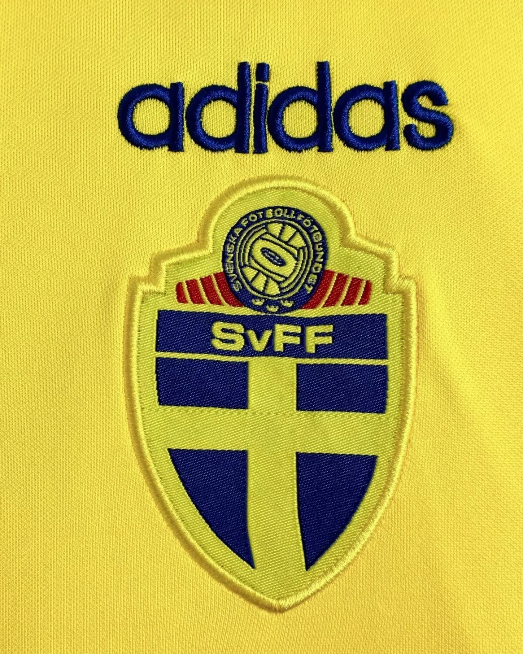 Sweden’s legendary 1994 World Cup Home Jersey powered Tommy Svensson’s golden generation to their greatest tournament achievement, securing bronze after defeating Bulgaria 4-0 in the third-place match as the competition’s top scorers with 15 goals, worn by Kennet Andersson, Martin Dahlin, Tomas Brolin, and Henrik Larsson during their USA ’94 heroics. The iconic yellow base with blue accents features V-neck collar, embroidered three-crown Swedish crest and Adidas logo on the center, and sponsor-free purity across the chest, timeless Blågult design embodying Scandinavian football’s golden era.