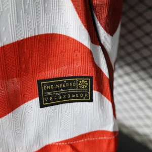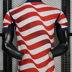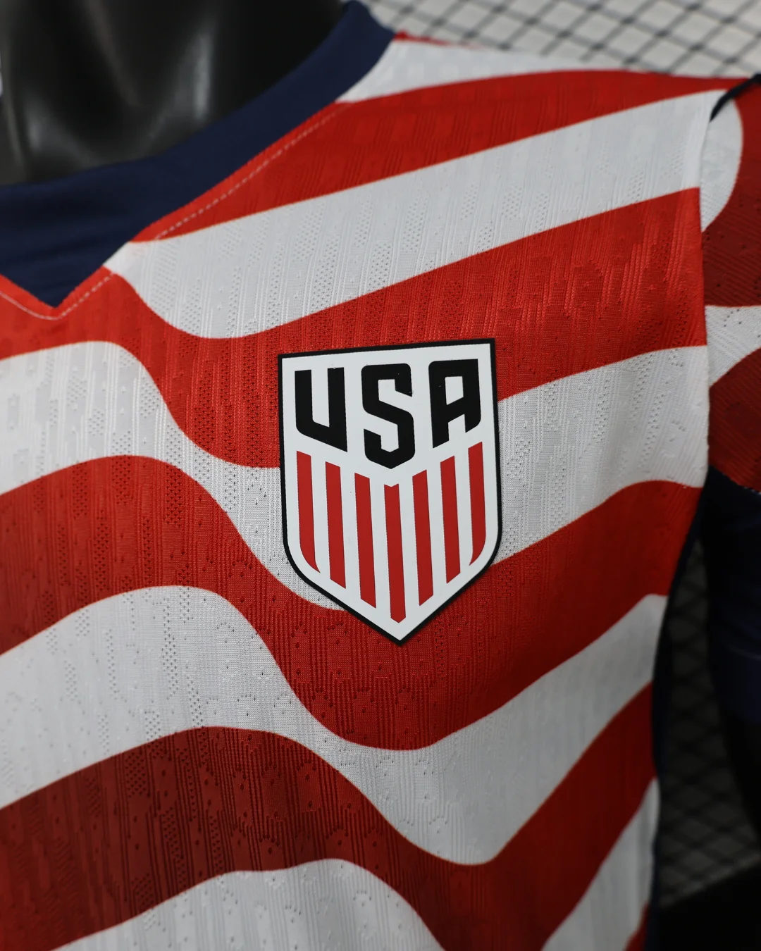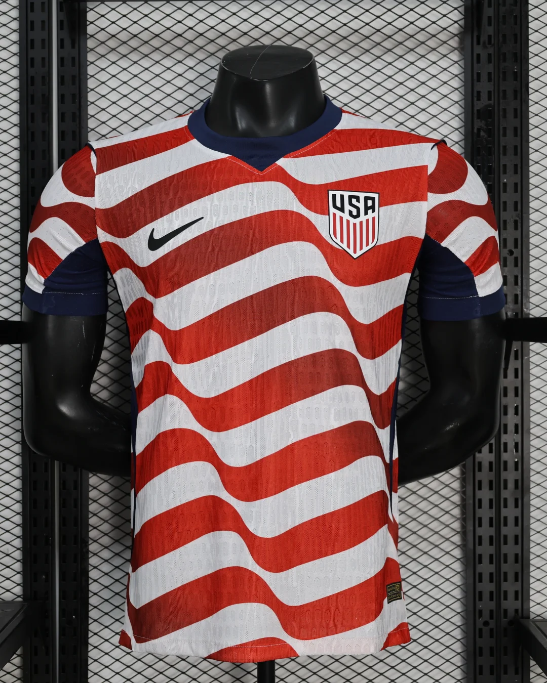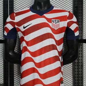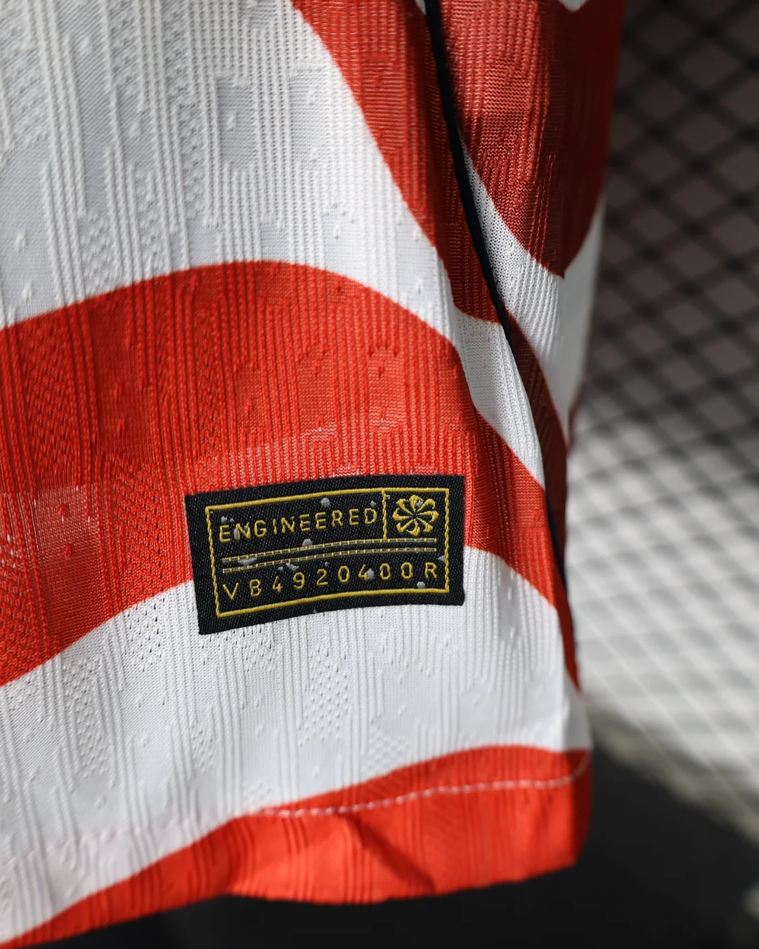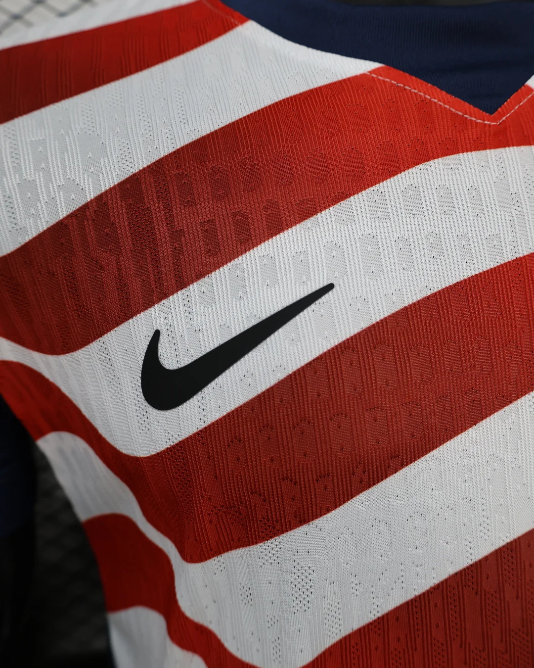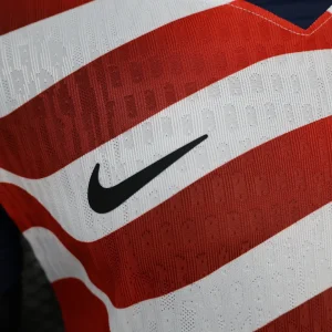 The USA’s 2026 World Cup Home Authentic Jersey from Nike celebrates hosting duties across North America with a bold reinterpretation of the American flag, featuring wavy undulating stripes in a striking palette of maroon-tinted deep red, brighter primary red, off-white, and navy blue accents that create dynamic movement across the chest, crewneck collar with navy trim, AERO-FIT moisture-wicking technology with strategic mesh ventilation zones. Perfect for young USMNT supporters, this player-issue uses ultralight 100% recycled polyester engineered knit construction for elite speed and recovery, US Soccer Federation crest on left chest and contoured athletic fit with laser-cut seams.