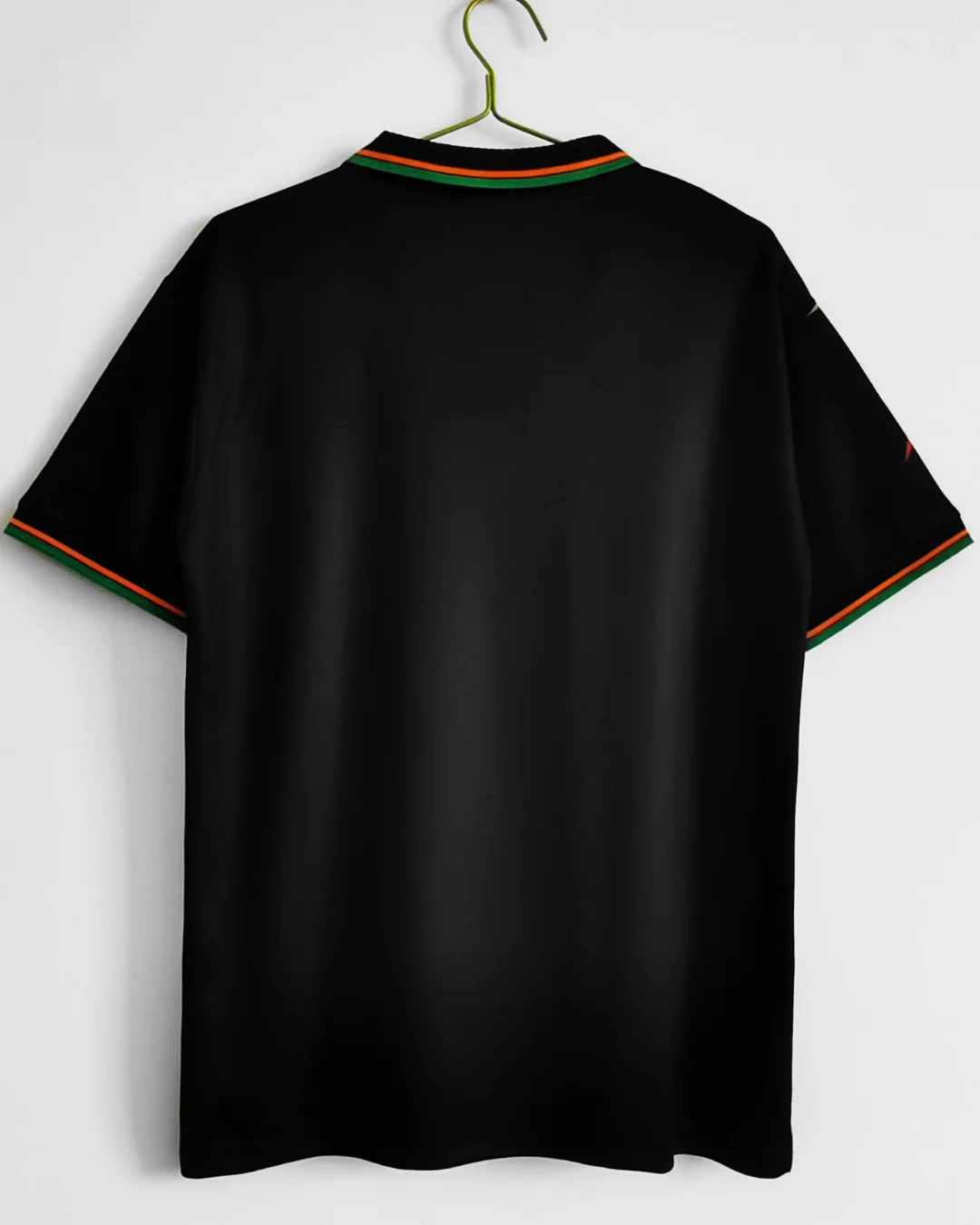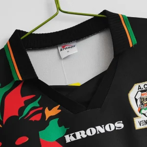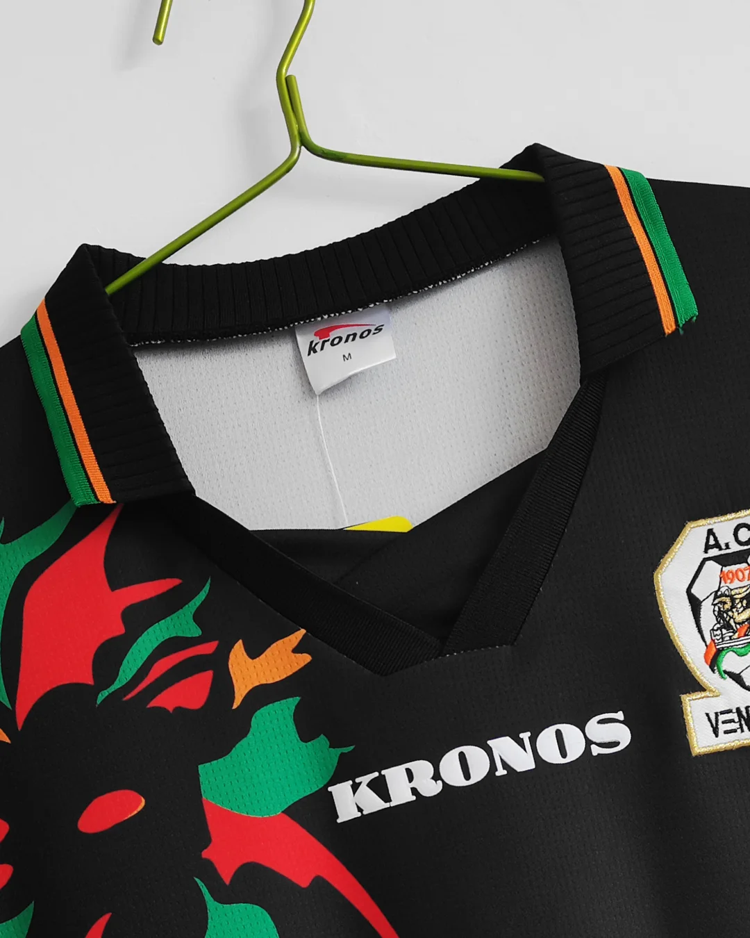 Celebrate a distinctive and colorful era of Italian football with the Venezia FC 1998/99 Home Jersey, a masterpiece that embodies the unique spirit and culture of Venice’s beloved club. This vibrant jersey was worn during a memorable Serie A season, marked by the club’s spirited performances and iconic players like Álvaro Recoba. Designed by Kronos, the jersey showcases the club’s traditional black base with green, red and orange details, a bold color combination symbolic of the city’s rich history and flair.