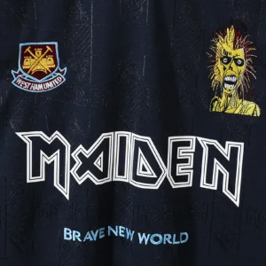 Celebrate a unique fusion of football and rock with the West Ham United x Iron Maiden 1999 Home Jersey, a special edition kit that brings together the iconic English football club and legendary heavy metal band Iron Maiden. Released during the 1999 season when West Ham was sponsored by Fila, this collaboration saw the traditional sponsor replaced by the unmistakable Iron Maiden black and red logo across the chest.